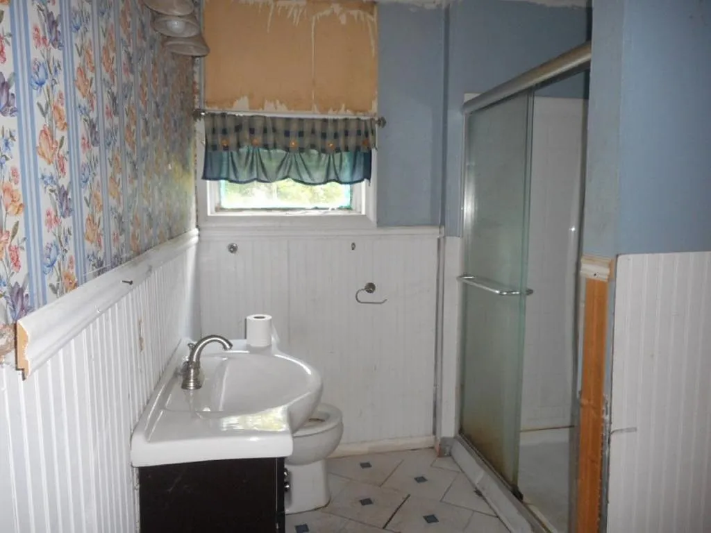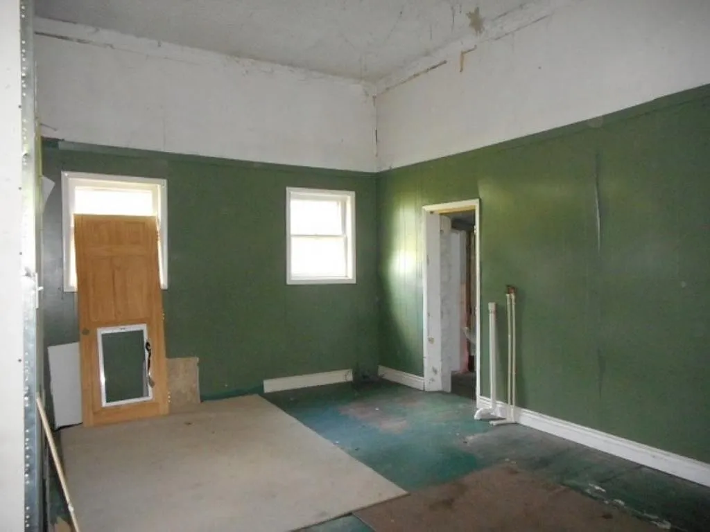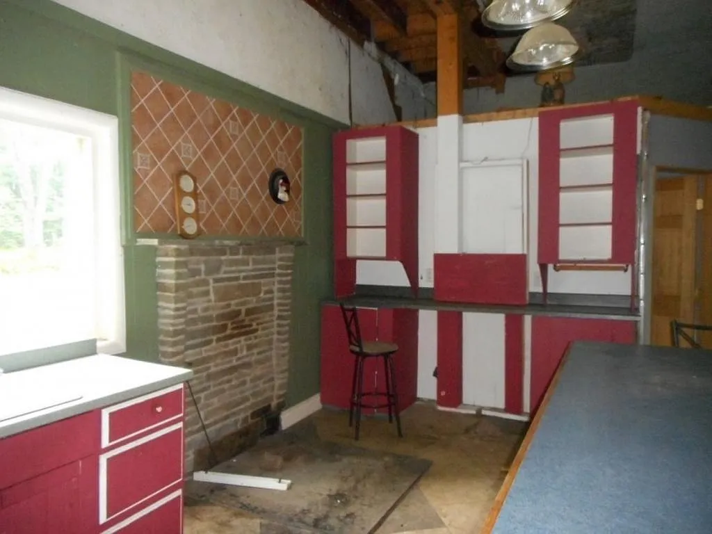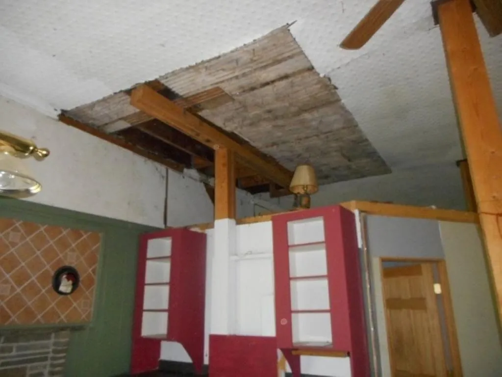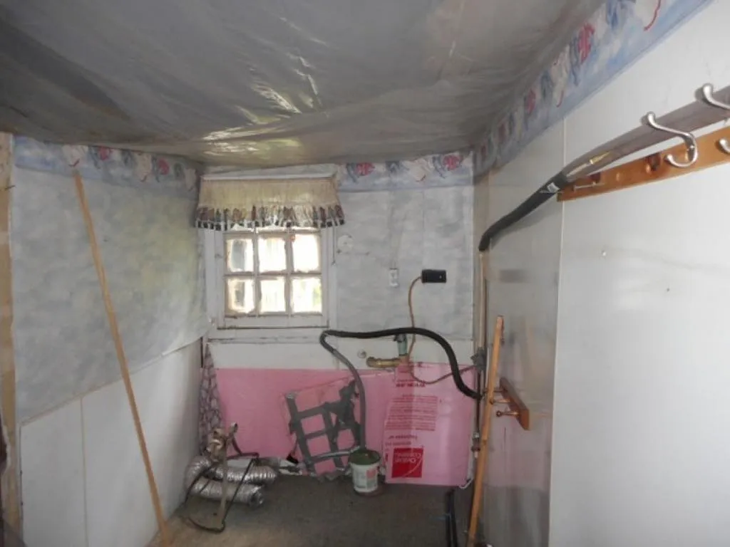 Former bathroom and kitchen areas showing residential modifications, exposed utilities, ceiling damage, and non-original finishes introduced during later occupancy.