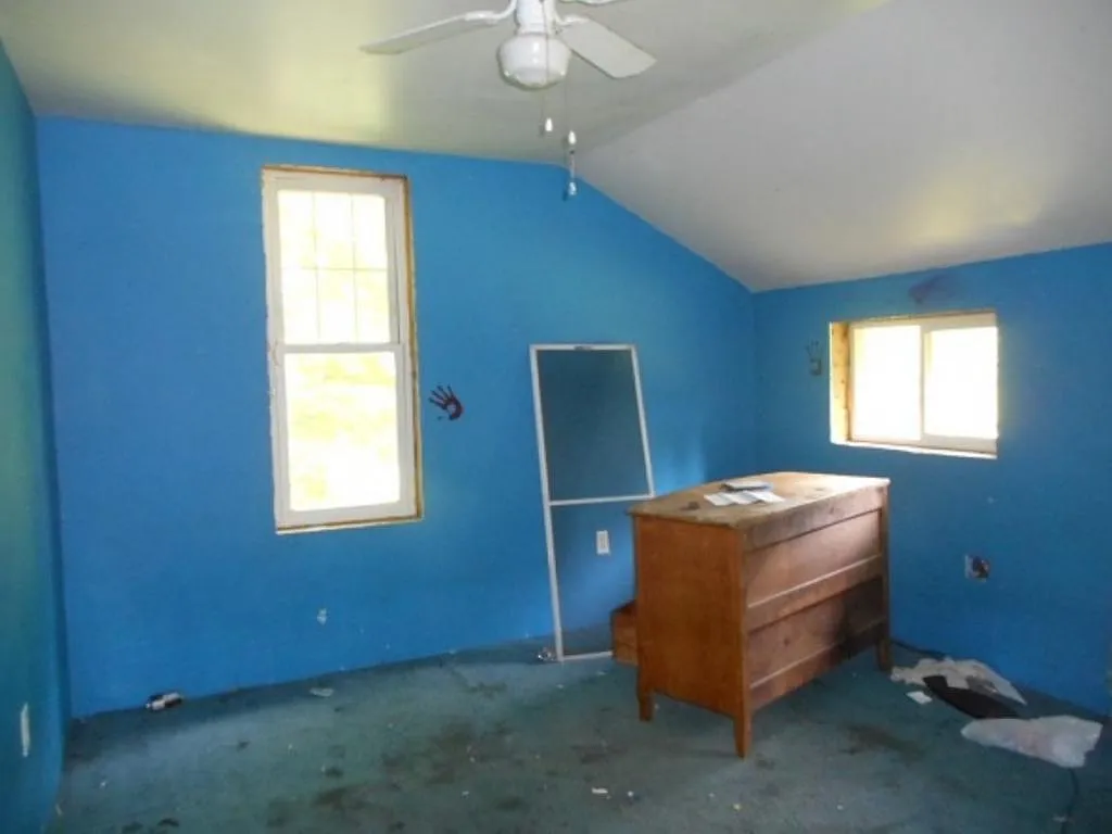 Upper-level and interior rooms showing fire-related damage, sagging planes, and the condition of living spaces prior to restoration.